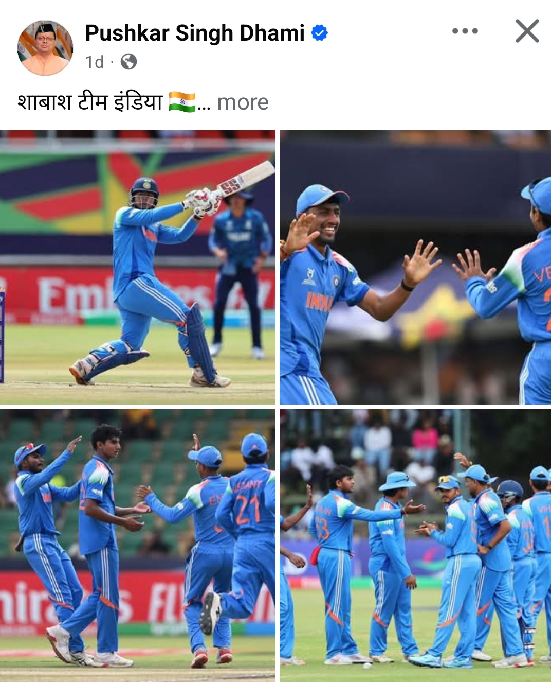 मुख्यमंत्री श्री पुष्कर सिंह धामी ने आईसीसी अंडर-19 क्रिकेट विश्व कप के फाइनल मुकाबले में इंग्लैंड को पराजित कर खिताब जीतने पर भारतीय अंडर-19 क्रिकेट टीम को हार्दिक बधाई एवं शुभकामनाएँ दी हैं।