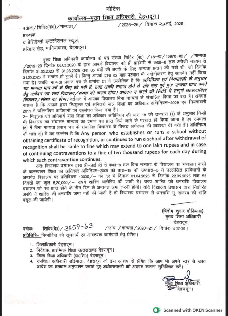 जिले के भानियावाला में अवस्थित प्रसिडंेसी इन्टरनेशनल स्कूल का फीस बढोतरी पर 100 से अधिक अभिभावकों द्वारा डीएम को शिकायत की गई थी। डीएम के निर्देश पर सीडीओ पर बुलाये जाने के उपरान्त भी स्कूल प्रबन्धन उपस्थित नही हो रहे थे। अभिलेखों की जांच करने पर पाया गया कि विद्यालय को प्री प्राईमरी से कक्षा 8 तक अंग्रेजी माध्यम से मार्च 2020 से मार्च 2025 तक की अवधि 5 वर्ष के लिए मान्यता प्रदान की गई थी, जबकि स्कूल प्रबन्धन द्वारा मान्यता नवीनीकरण के लिए अभी तक आवेदन नही किया गया है, जिस पर जिला प्रशासन द्वारा द प्रसिडेंसी विद्यालय पर प्री-प्राईमरी से कक्षा-8 तक बिना मान्यता के विद्यालय का संचालन करने के फलस्वरूप शिक्षा का अधिकार अधिनियम-2009 की धारा-18 की उपधारा-5 में उल्लेखित प्राविधानों के अन्तर्गत विद्यालय पर प्रतिदिवस 10,000/- की दर से दिनांक 1 अपै्रल 2025 से 22 मई 2025 तक 52 दिवसों का कुल 5,20,000/- रूपये शास्ति आरोपित कर दी गई है। उक्त शास्ति की धनराशि विद्यालय प्रशासन को पत्र प्राप्त होने के तीन दिन के अन्तर्गत जमा करने के निर्देश दिए हैं। यदि विद्यालय प्रशासन द्वारा निर्धारित अवधि में शास्ति की धनराशि जमा नहीं की जाती है तो विद्यालय प्रशासन से धनराशि भू-राजस्व की भाँति वसूल की जायेगी।