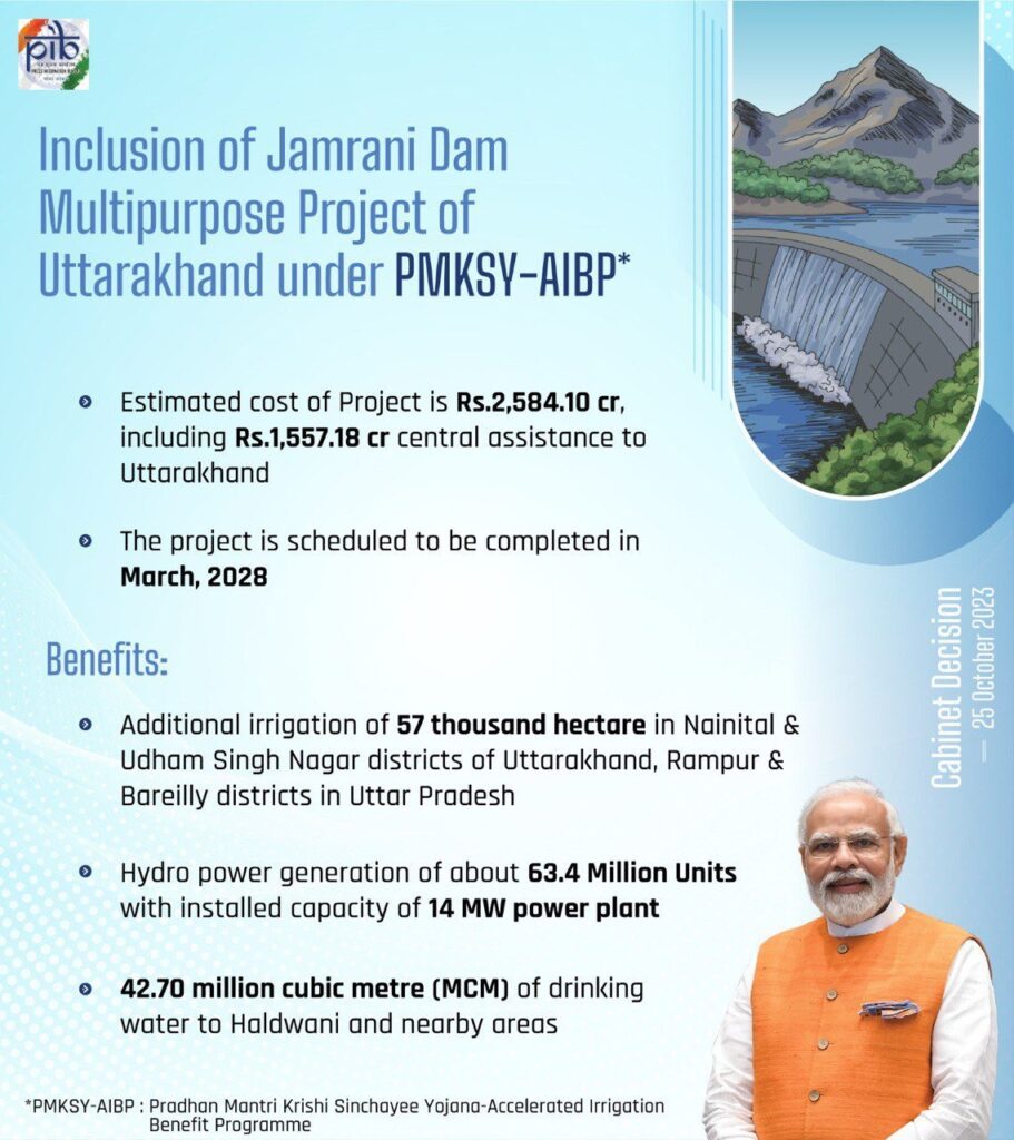 उत्तराखंड के लिहाज से बेहद महत्वपूर्ण जमरानी बांध परियोजना को केंद्रीय कैबिनेट की आर्थिक मामलों की समिति ने अपनी मंजूरी प्रदान कर दी है। इसके लिए मुख्यमंत्री पुष्कर सिंह धामी ने प्रधानमंत्री श्री नरेंद्र मोदी का आभार जताते हुए कहा कि इस बांध परियोजना के निर्माण का रास्ता साफ होने से हल्द्वानी व आसपास के क्षेत्र में पेयजल एवं सिंचाई की समस्या का हल होगा।