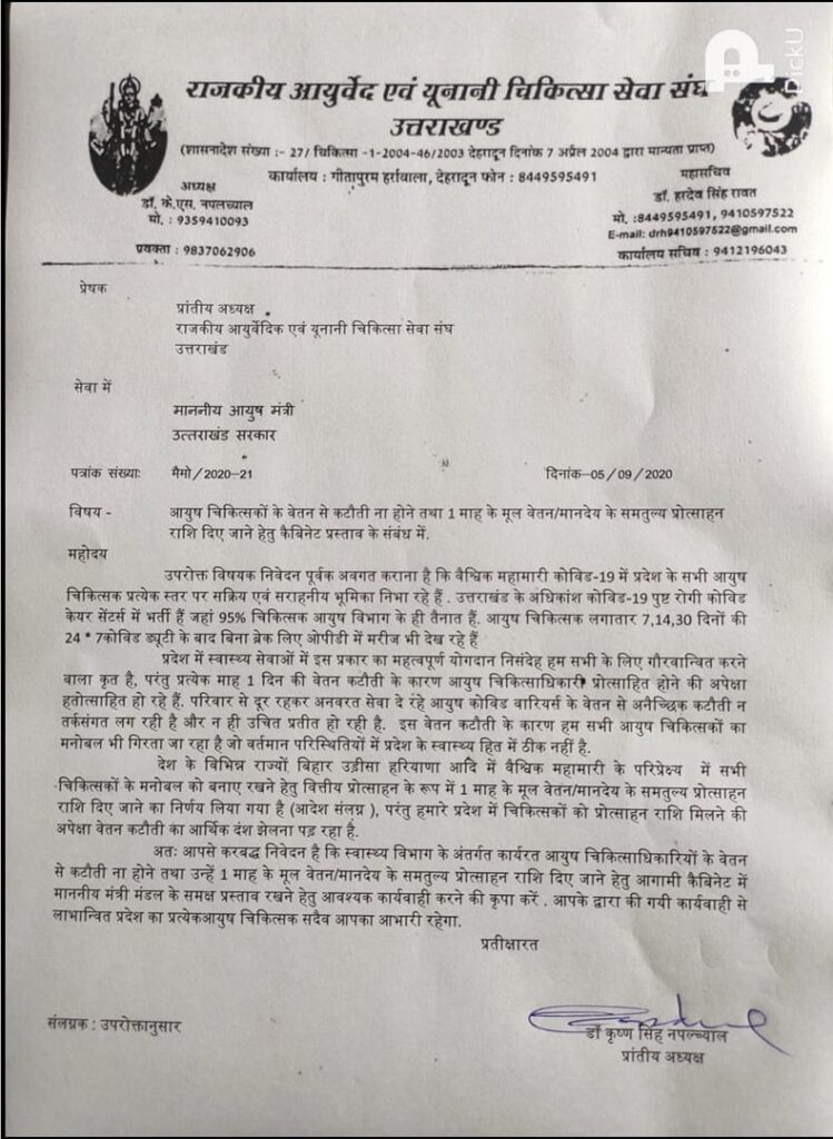 इधर प्रान्तीय महासचिव डॉ० हरदेव रावत एवं प्रान्तीय उपाध्यक्ष डॉ० अजय चमोला ने भी आयुष चिकित्सकों एवं स्टाफ के एक दिन की वेतन कटौती पर तुरन्त रोक लगाये जाने की मांग की है, एवं सरकार से प्रोत्साहन भत्ता देने का अनुरोध किया गया है।