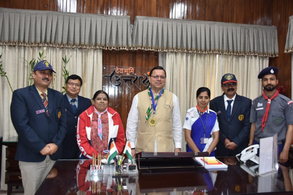 मुख्यमंत्री श्री पुष्कर सिंह धामी से सोमवार को मुख्यमंत्री कैम्प कार्यालय में भारत स्काउट एवं गाइड की स्थापना दिवस के अवसर पर भारत स्काउट एवं गाइड के प्रतिनिधि दल ने भेंट की। इस अवसर पर प्रतिनिधि दल ने मुख्यमंत्री को स्टीकर एवं ध्वज लगाया। मुख्यमंत्री ने अंशदान देते हुए कहा कि अधिक से अधिक छात्रों को स्काउट एवं गाइड से जोड़ा जाए। उन्होंने कहा कि अनुशासन, सेवा भाव और परोपकार के कार्यों में भारत स्काउट एवं गाइड की महत्वपूर्ण भूमिका है।