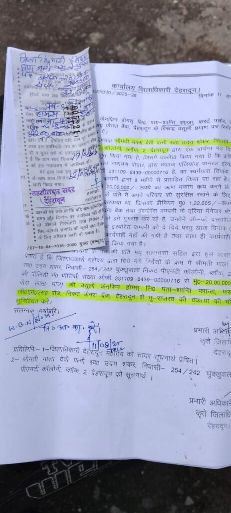 चुक्खुवाला निवासी दो बेटो की व्यथित विधवा मा माला देवी ने डीएम ने फरियाद लगाई की उनके पति स्व उदय शंकर द्वारा कैनफिन लि0 से रू0 20 लाख का ऋण मकान क्रय करने के लिए लिया गया था जिसका बीमा भी कराय गया है रू0 12.22 लाख किस्त भी जमा कराई गई हैं किन्तु पति की मृत्यु 20 जनवरी 2025 को हो गई थी, पति की मृत्यु के उपरान्त इश्योंरेश कम्पनी व बैंक के पास मकान के दस्तावेज हैं कम्पनी द्वारा कोई कार्यवाही नही की गई है उनको परेशान किया जा रहा है उनके 2 नौनिहालों की पढाई भी बाधित हो रही है बैंक और इंश्योरेंश कम्पनी परेशान कर रही हैं जिस पर जिलाधिकारी ने केनफिन होम लि0 जीएमएस रोड के प्रबन्धक की रू0 22 लाख की आरसी काट दी थी अब जिल प्रशासन द्वारा बैंक की सम्पति कुर्क करते हुए 23 अगस्त को नीलामी निकाल दी है।
