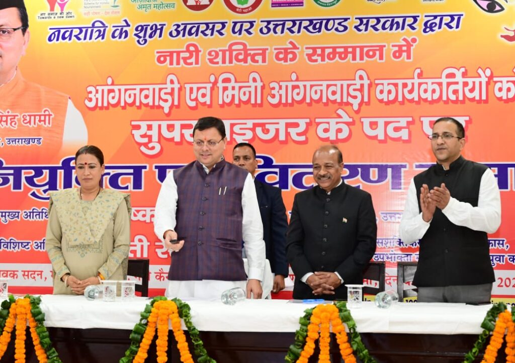 मुख्यमंत्री श्री पुष्कर सिंह धामी ने रविवार को मुख्य सेवक सदन, मुख्यमंत्री आवास, देहरादून में आयोजित कार्यक्रम में प्रतिभाग करते हुए प्रदेश की 167 आंगनवाड़ी एवं मिनी आंगनवाड़ी कार्यकर्तियों को सुपरवाइजर के पद पर नियुक्त होने पर नियुक्ति पत्र वितरित किए। इस अवसर पर उन्होंने नन्दा गौरा योजना एवं मुख्यमंत्री महालक्ष्मी किट योजना के ऑनलाइन पोर्टल का शुभारंभ भी किया।