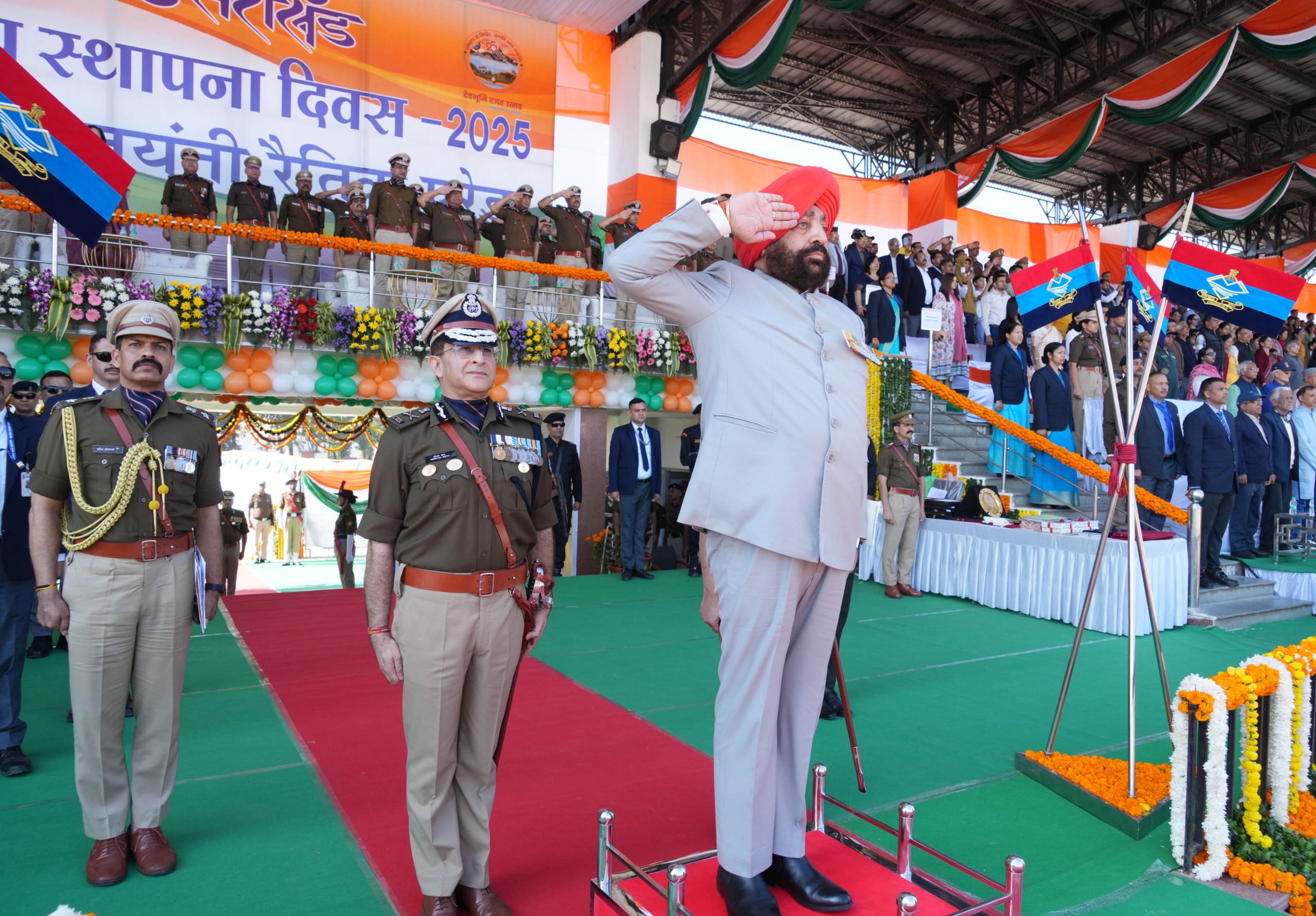 उत्तराखण्ड राज्य स्थापना के रजत जयंती समारोह के अवसर पर शुक्रवार को पुलिस लाइन, देहरादून में आयोजित कार्यक्रम में राज्यपाल लेफ्टिनेंट जनरल गुरमीत सिंह (से नि) एवं मुख्यमंत्री श्री पुष्कर सिंह धामी ने प्रतिभाग किया। राज्यपाल ने इस अवसर पर आयोजित रैतिक परेड का निरीक्षण कर सलामी ली। राष्ट्रीय गीत ‘‘वंदे मातरम’’ के 150 वर्ष पूर्ण होने के अवसर पर कार्यक्रम की शुरुआत वंदे मातरम गीत से हुई। इस अवसर पर राज्यपाल एवं मुख्यमंत्री द्वारा ‘‘उत्तराखण्ड पुलिस पत्रिका-2025’’ का विमोचन एवं रजत जयंती पदक के प्रतीकात्मक चिन्ह का अनावरण किया गया।