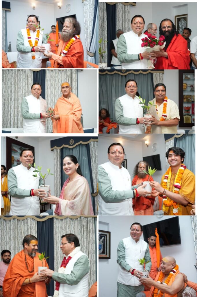 मुख्यमंत्री आवास में आध्यात्मिक संगम में जगद्गुरु शंकराचार्य राजराजेश्वर महाराज, आचार्य महामंडलेश्वर कैलाशानंद गिरी जी महाराज, जूनापीठाधीश्वर आचार्य महामंडलेश्वर स्वामी अवधेशानंद गिरि जी,परमार्थ निकेतन, ऋषिकेश के अध्यक्ष पूज्य स्वामी चिदानंद सरस्वती जी,अखाड़ा परिषद अध्यक्ष स्वामी रविंद्रपुरी महाराज, बागेश्वर धाम पीठाधीश्वर पं. धीरेंद्र कृष्ण शास्त्री,पतंजलि योगपीठ के आचार्य बालकृष्ण,प्रसिद्ध आध्यात्मिक वक्ता जया किशोरी,चिंतक और लेखक डॉ. कुमार विश्वास सहित अनेकों प्रतिष्ठित संत-महात्मा एवं धर्माचार्य भेंट करने वाले प्रमुख संत-महात्माओं में शामिल रहे |