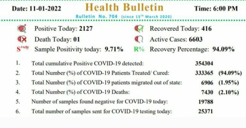 राज्य में आज कोरोना के 2127 नए मरीज, 01 मौतों के साथ कोरोना पॉजिटिव की मौत का आंकड़ा पहुंचा 7430, जबकि , 416 मरीज स्वस्थ होकर डिस्चार्ज हुए है।